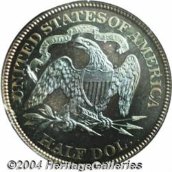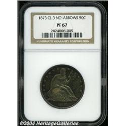 <B>1873<50C> No Arrows PR67 NGC.</B></I> Gorgeous ruby-red, gold, apple-green, and navy-blue colors enliven the obverse, while the reverse is also beautifully toned in peach and ocean-blue hues. A meticulously struck and splendidly preserved specimen. 600 proofs were struck at the old tenor (12.44 grams) with a Closed 3 and No Arrows, and an additional 550 Open 3 proofs were produced at a higher tenor (12.50 grams) with arrows bookending the date. The latter issue sells for substantially more due its status as a short-lived type. However, the No Arrows variety provides better value for similar rarity. Population: 4 in 67, none finer (5/04). <BR><BR><B>Important notice:</B> Heritage usually auctions material at the rate of 200-250 lots per hour. On some occasions eBay Live bid software or the Internet may not be able to keep up with the pace of the auction. We recommend placing a realistic absentee bid now as insurance to avoid disappointment. Occasionally the auctioneer may eliminate or reject an eBay Live bid, and the auctioneer may also reopen a lot after the close of the eBay live bidding (usually because we missed an audience bid), and may reject your bid even if it shows you as the winning bidder. By bidding via eBay Live, you agree that Heritage may award the lot to another bidder at its sole discretion under the circumstances described above or any other reasonable circumstances. Since eBay bids are not shown to us until we open the lot on the floor, we treat those bids just like floor bids. In most cases the floor responds before the eBay bid is presented to us, due to Internet lag time, so for consistency we have made it a policy that floor bids are always considered first over tie eBay live bids. Also please note that all Heritage lots purchased through eBay Live carry a 20% Buyer's Premium. Please make sure you read the Terms and Conditions before you bid. </span></font></tr></table></td></tr></table>