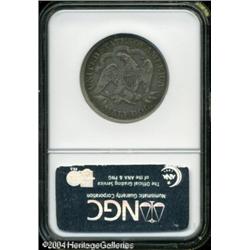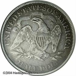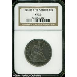1873 50C Open 3, No Arrows VF25 NGC. The rarity of <B>1873 50C Open 3, No Arrows VF25 NGC.</B></I> The rarity of this issue is well known throughout the numismatic community. Although Mint records indicate that 214,200 Open 3 Half Dollars were produced, most of these coins were undoubtedly melted to provide silver for the Arrows coinage of this same year. This is a richly toned survivor whose surfaces are drenched in medium steel-gray patina with lighter accents on the highpoints. There are remarkably few abrasions for a circulated example, particularly on the obverse, and the devices display only light, even wear. Sure to be of interest to Seated Half Dollar specialists. NGC and PCGS combined have seen just 19 coins in all grades (11/04). <BR><BR><B>Important notice:</B> Heritage usually auctions material at the rate of 200-250 lots per hour. On some occasions eBay Live bid software or the Internet may not be able to keep up with the pace of the auction. We recommend placing a realistic absentee bid now as insurance to avoid disappointment. Occasionally the auctioneer may eliminate or reject an eBay Live bid, and the auctioneer may also reopen a lot after the close of the eBay live bidding (usually because we missed an audience bid), and may reject your bid even if it shows you as the winning bidder. By bidding via eBay Live, you agree that Heritage may award the lot to another bidder at its sole discretion under the circumstances described above or any other reasonable circumstances. Since eBay bids are not shown to us until we open the lot on the floor, we treat those bids just like floor bids. In most cases the floor responds before the eBay bid is presented to us, due to Internet lag time, so for consistency we have made it a policy that floor bids are always considered first over tie eBay live bids. Also please note that all Heritage lots purchased through eBay Live carry a 20% Buyer's Premium. Please make sure you read the Terms and Conditions before you bid. This lot is being auctioned in conjunction with a live floor auction by Heritage Galleries & Auctioneers. All final auction and invoice information will be supplied by Heritage Galleries & Auctioneers, and all other information should be considered preliminary. Lot:6097