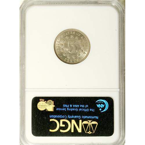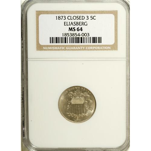 <B>1873 5C Closed 3 MS64 NGC.</B></I> Ex: Eliasberg. Lustrous surfaces display hints of gold-gray color, and are nicely preserved. The design features are well impressed. This is a piece that the variety collector should examine closely for the date is noticeably doubled, despite considerable weakness of strike. This date is a favorite with collectors of Shield nickels due to the large number of varieties. An overdate is listed by Breen in his <I>Complete Encyclopedia,</B></I> although most specialists do not recognize such a variety.<BR><I>From The Collection of Louis E. Eliasberg, Sr.</B></I><BR><BR><b>Shipping:</b> Coin/Currency (<a target="_blank" href="http://www.heritageauctions.com/common/shipping.php">view shipping information</a>)