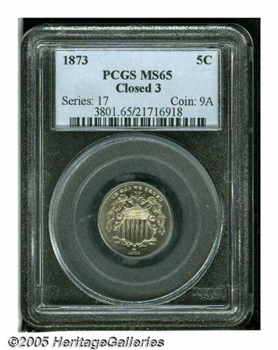 <B>1873<5C> Closed 3 MS65 PCGS.</B></I> A well struck and highly prooflike example that has light olive-gray color. The obverse is well preserved, while the reverse has a few minor contact marks. The upper obverse has heavy die cracks, as struck. Population: 6 in 65, 2 finer (4/05).<BR><I>From The Western Hills Collection.</B></I>