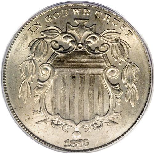 <B>1873 5C Closed 3 MS65 PCGS.</B></I> The Closed 3 and Open 3 varieties have similar mintages and availability, and the different date configurations are chiefly of interest to specialists. Proofs are also of the Closed 3 variety. This particular piece is lustrous and shows even, light rose-gray color. Close examination shows the expected die cracks, usually seen on Shield nickels, and a few light carbon spots on the obverse. Very scarce in Gem condition. Population: 8 in 65, 3 finer (3/07).<BR><BR><b>Shipping:</b> Coins & Currency (<a target="_blank" href="http://www.heritageauctions.com/common/shipping.php">view shipping information</a>)