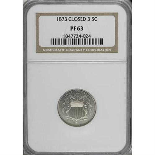 <B>1873 5C Closed 3 PR63 NGC.</B></I> NGC Census: (40/230). PCGS Population (68/300). Mintage: 1,100. Numismedia Wsl. Price for NGC/PCGS coin in PR63: $270. (#3827)<BR><BR><B>Coin Engraver:</B> James B. Longacre<BR><BR><b>Shipping:</b> Coins & Currency (<a target="_blank" href="http://www.heritageauctions.com/common/shipping.php">view shipping information</a>)