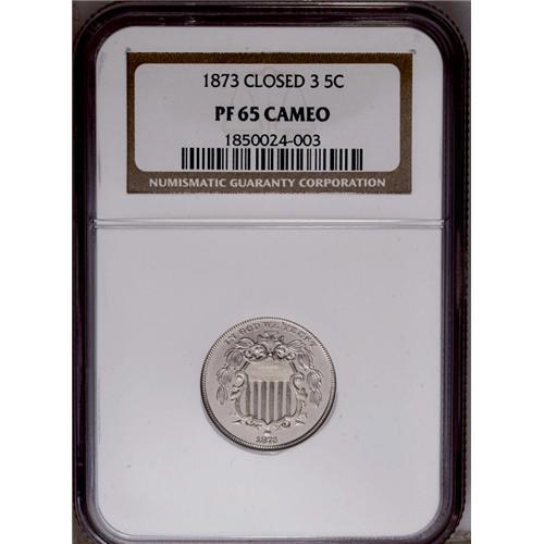 <B>1873<5C> Closed 3 PR65 Cameo NGC.</B></I> A virtually stone-white Gem with flashy, unperturbed fields and a pinpoint strike. The shield provides noticeable cameo contrast. The 1 in the date is lightly repunched. Census: 11 in 65 Cameo, 12 finer (5/06).