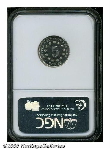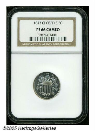 <B>1873<5C> Closed 3 PR66 Cameo NGC.</B></I> The 1 in the date is lightly repunched. Sharply struck with heavily frosted devices and intensely reflective jet-black fields. Both sides seem pristine. Very scarce with full Cameo contrast. Population: 7 in 66 Cameo, 3 finer (4/05).