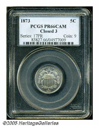 <B>1873<5C> Closed 3 PR66 Cameo PCGS.</B></I> The 1 in the date is repunched north. Sharply struck and untoned, with a bright frosty appearance and shimmering, impeccably preserved surfaces. All proof 1873 Shield Nickels display a Closed 3 in the date. Population: 13 in 66 Cameo, 0 finer (5/05).<BR><I>From The Western Hills Collection.</B></I>