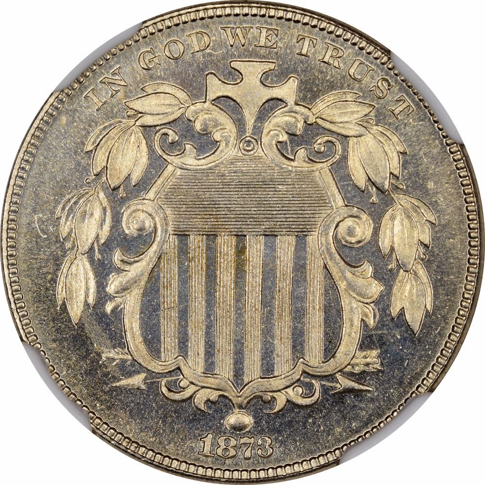 This satiny Proof Shield nickel is not far off the mark for a cameo designation in our eyes. The devices are lightly dusted and contrast slightly with the satiny, chiefly reflective fields. All nickel five-cent piece Proofs of the date are of the Closed 3 variety. Choice for the grade at many levels.