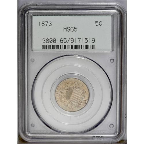 <B>1873<5C> Open 3 MS65 PCGS.</B></I> Rich champagne-gold toning adorns the seemingly pristine surfaces. Crisply struck with scintillating luster, this is a lovely no-questions Gem. Population: 23 in 65, 6 finer (3/06). <BR><BR><B>Important notice:</B> Heritage usually auctions material at the rate of 200-250 lots per hour. On some occasions eBay Live bid software or the Internet may not be able to keep up with the pace of the auction. We recommend placing a realistic absentee bid now as insurance to avoid disappointment. Occasionally the auctioneer may eliminate or reject an eBay Live bid, and the auctioneer may also reopen a lot after the close of the eBay live bidding (usually because we missed an audience bid), and may reject your bid even if it shows you as the winning bidder. By bidding via eBay Live, you agree that Heritage may award the lot to another bidder at its sole discretion under the circumstances described above or any other reasonable circumstances. Since eBay bids are not shown to us until we open the lot on the floor, we treat those bids just like floor bids. In most cases the floor responds before the eBay bid is presented to us, due to Internet lag time, so for consistency we have made it a policy that floor bids are always considered first over tie eBay live bids. Also please note that all Heritage lots purchased through eBay Live carry a 20% Buyer's Premium. Please make sure you read the Terms and Conditions before you bid. This lot is being auctioned in conjunction with a live floor auction by Heritage Galleries & Auctioneers. All final auction and invoice information will be supplied by Heritage Galleries & Auctioneers, and all other information should be considered preliminary. Lot:856 <BR><BR><B>Winning Notification and Billing:</B> After the FINAL session in this auction is complete, Heritage will send e-mail and snail mail invoices. This process normally takes several days. All final auction and invoice information will be supplied by Heritage Galleries & Auctioneers, and all other information should be considered preliminary. <BR><BR>This auction will be conducted on a live auction floor and over the Internet through eBay Live. If you choose to place an absentee bid, please take a moment to <font color='#0000ff'><u><a href='http://pages.ebay.com/liveauctions/help/before/laabsentee.html'>learn how eBay Live absentee bidding works</a></u></font><font color='#000000'>