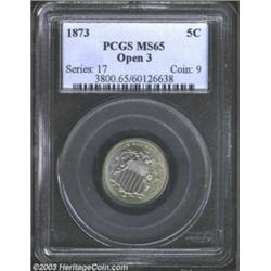 <TABLE cellSpacing=0 cellPadding=0 width="100%" bgColor=#000000 border=0><TBODY><TR><TD width="100%"><TABLE cellSpacing=1 cellPadding=3 width="100%" border=0><TBODY><TR><TD width="100%" bgColor=#79735c><FONT face=arial color=#ffffff size=3><B>Description</B> </FONT></TD></TR><TR><TD width="100%" bgColor=#ffffff><FONT face=arial size=2><B>1873 5C Open 3 MS65 PCGS.</B></I> Well struck beneath milky golden-gray patina, with a splash of apricot toning on the lower reverse. The radiant surfaces are defect-free, and display a pair of spidery die cracks (as struck) near the upper obverse rim. Population: 20 in 65, 5 finer (4/03). </FONT></TD></TR></TBODY></TABLE></TD></TR></TBODY></TABLE><BR><A name=PricesRealized></A><TABLE cellSpacing=0 cellPadding=0 width="100%" bgColor=#000000 border=0><TBODY><TR><TD width="100%"><TABLE cellSpacing=1 cellPadding=3 width="100%" border=0><TBODY><TR><TD width="100%" bgColor=#79735c><A name=PR><FONT face=arial color=#ffffff size=3><B>Previous Prices from Heritage Auctions</B> </FONT></A></TD></TR><TR><TD bgColor=#f6f6ed><TABLE cellSpacing=0 cellPadding=0 width="100%" border=1><TBODY><TR><TD align=middle width="33%"><B>Date</B></TD><TD align=middle width="33%"><B>Service</B></TD><TD align=middle width="33%"><B>Price</B></TD></TR><TR bgColor=whitesmoke><TD width="33%"><B>03/23/2003</B></TD><TD width="33%">PCGS</TD><TD width="33%">$1,840.00</TD></TR><TR bgColor=whitesmoke><TD width="33%"><B>11/23/2002</B></TD><TD width="33%">NGC</TD><TD width="33%">$603.75</TD></TR></TBODY></TABLE></TD></TR><TR><TD bgColor=#ffffff><FONT face=arial size=1 ?>PLEASE NOTE: All prices realized reflect the final hammer price PLUS the buyer's premium in auctions that charge a buyer's premium. Each item has a notation at the top of the listing indicating whether that lot included a buyer's premium. Example: A item that sells with a final hammer price of $100 and a 20% buyer's premium will display with a price realized of $120. All information listed is intended to be as accurate as possible, but errors are possible. Please use this guide carefully and inform us of any inaccuracies. </FONT></TD></TR></TBODY></TABLE></TD></TR></TBODY></TABLE><BR><TABLE cellSpacing=0 cellPadding=0 width="100%" bgColor=#000000 border=0><TBODY><TR><TD width="100%"><TABLE cellSpacing=1 cellPadding=3 width="100%" border=0><TBODY><TR><TD width="100%" bgColor=#79735c colSpan=6><FONT face=arial color=#ffffff size=3><B>Price Guide*</B> </FONT></TD></TR><TR bgColor=#f6f6ed><TD align=middle><B>Grade</B> </TD><TD align=middle><B>Coin World<BR>(Trends)</B> </TD><TD align=middle><B>Numismedia<BR>Retail</B> </TD><TD align=middle><B>Numismedia<BR>Wholesale</B> </TD><TD align=middle><B>Coin<BR>Universe</B> </TD><TD align=middle><B>Heritage<BR>Value Index</B> </TD></TR><TR bgColor=#ffffff><TD align=middle>64</TD><TD align=right>$400.00</TD><TD align=right>$530.00</TD><TD align=right>$424.00</TD><TD align=right>$405.00</TD><TD align=right>$268.83</TD></TR><TR style="FONT-WEIGHT: bold" bgColor=#cccfdd><TD align=middle>65</TD><TD align=right>$1,150.00</TD><TD align=right>$920.00</TD><TD align=right>$735.00</TD><TD align=right>$1,175.00</TD><TD align=right>$820.00</TD></TR><TR bgColor=#ffffff><TD align=middle>66</TD><TD align=right>$2,250.00</TD><TD align=right>---</TD><TD align=right>$1,250.00</TD><TD align=right>$2,450.00</TD><TD align=right>$1,738.00</TD></TR><TR bgColor=#ffffff><TD colSpan=6><FONT size=1>*All information listed is intended to be as accurate as possible, but errors are possible. No item may be returned or refused based on this information which is provided as a service to our customers. You should contact each pricing source directly to determine the accuracy of this information. </FONT></TD></TR></TBODY></TABLE></TD></TR></TBODY></TABLE><BR><TABLE cellSpacing=0 cellPadding=0 width="100%" bgColor=#000000 border=0><TBODY><TR><TD width="100%"><TABLE cellSpacing=1 cellPadding=3 width="100%" border=0><TBODY><TR><TD width="100%" bgColor=#79735c><FONT face=arial color=#ffffff size=3><B>Population Guide</B> </FONT></TD></TR><TR bgColor=#ffffff><TD align=middle><!-- Begin Output of Population Grid--><TABLE cellSpacing=0 cellPadding=0 width="100%" border=0><TBODY><TR><TD vAlign=center><TABLE cellSpacing=0 width="100%" border=1 cellsadding="3"><TBODY><TR><TD vAlign=center><TABLE cellSpacing=0 cellPadding=3 width="100%" border=1><TBODY><TR><TD vAlign=center align=middle bgColor=#f0f1e8 colSpan=2 <CENTER><FONT face=Arial size=2><B>PCGS Pop </B></FONT><CENTER></CENTER></TD><TD vAlign=center align=middle bgColor=#f0f1e8 colSpan=2><CENTER><FONT face=Arial size=2><B>NGC Pop</B></CENTER></FONT></TD></TR><TR><TD vAlign=center><FONT face=Arial size=2>(65)</FONT> </TD><TD vAlign=center align=right><FONT face=Arial size=2>20</FONT> </TD><TD vAlign=center><FONT face=Arial size=2>(65)</FONT> </TD><TD vAlign=center align=right><FONT face=Arial size=2>28</FONT> </TD></TR><TR><TD vAlign=center><FONT face=Arial size=2>(>65)</FONT> </TD><TD vAlign=center align=right><FONT face=Arial size=2>5</FONT> </TD><TD vAlign=center><FONT face=Arial size=2>(>65)</FONT> </TD><TD vAlign=center align=right><FONT face=Arial size=2>4</FONT> </TD></TR></TBODY></TABLE></TD></TR></TBODY></TABLE></TD></TR></TBODY></TABLE><!-- End Output of Population Grid--> Important notice: Heritage usually auctions material at the rate of 200-250 lots per hour. On some occasions eBay Live bid software or the Internet may not be able to keep up with the pace of the auction. We recommend placing a realistic absentee bid now as insurance to avoid disappointment. Occasionally the auctioneer may eliminate or reject an eBay Live bid, and the auctioneer may also reopen a lot after the close of the eBay live bidding (usually because we missed an audience bid), and may reject your bid even if it shows you as the winning bidder. By bidding via eBay Live, you agree that Heritage may award the lot to another bidder at its sole discretion under the circumstances described above or an