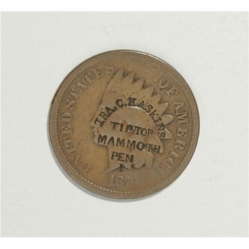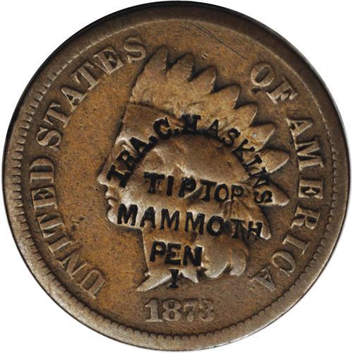 <B>1873-75 Ira C. Haskins Counterstamped Indian Cent, Amherst, MA, Ma-AM-8.</B></I> This is an unlisted variety with the added word Mammoth to the counterstamps that are listed on page 673 in the Rulau catalog. The host coin is a worn 1873 Indian cent, which would indicate the counterstamp may have been applied later than the listed year of 1875. A interesting discovery piece, with an approximate market value around $100.<BR><BR><b>Shipping:</b> Coins & Currency (<a target="_blank" href="http://www.heritageauctions.com/common/shipping.php">view shipping information</a>)