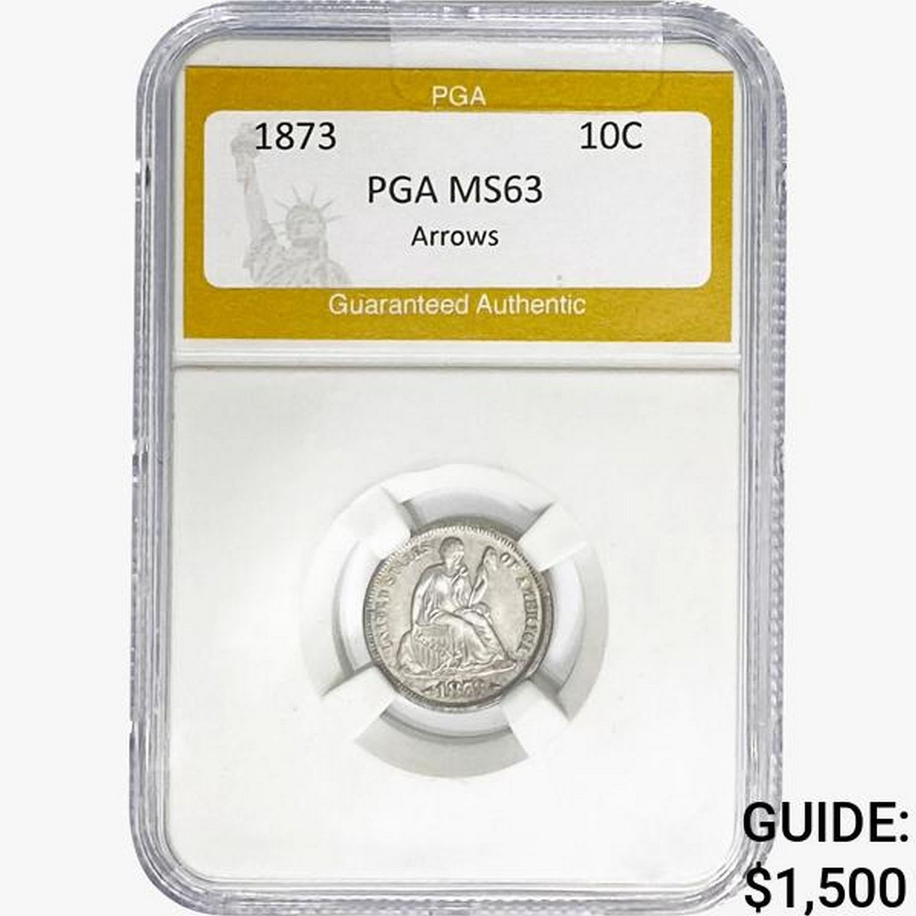 1873 ARROWS Seated Liberty Dime PGA MS63