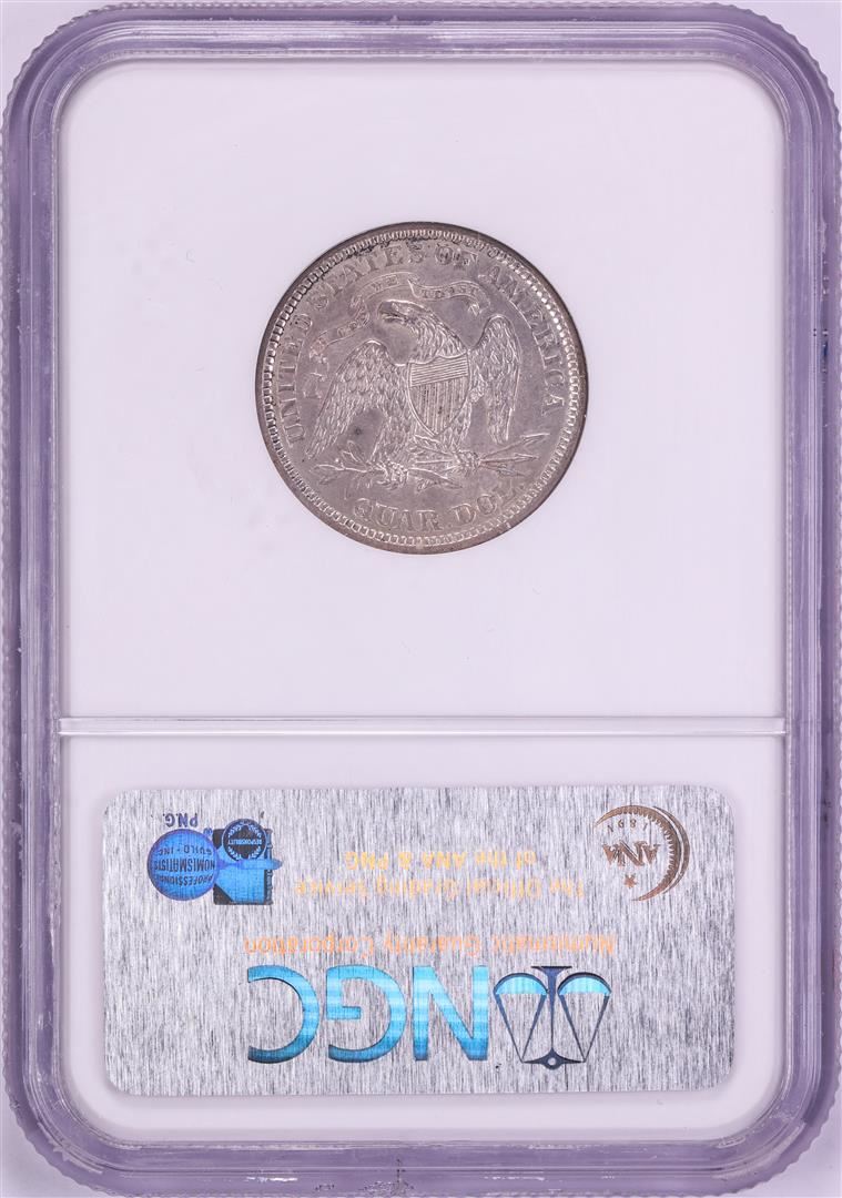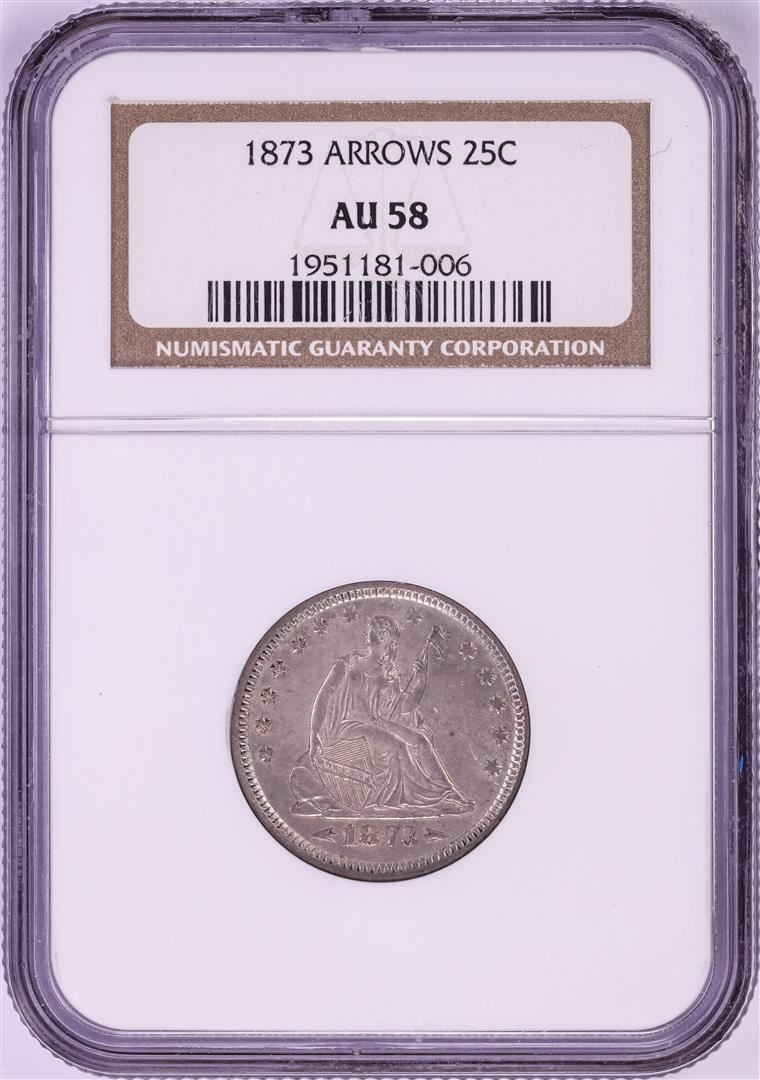 One 1873 Arrows Seated Liberty Quarter Coin NGC AU58. NGC Certified.