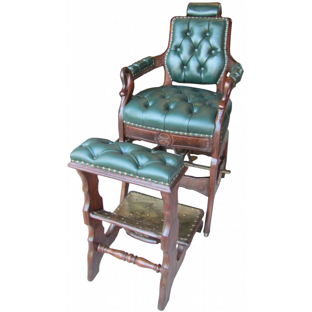 1873 Berninghaus Barber Chair and Footrest. Mahogany with swan arms. Restored with green tufted upolstery.