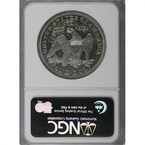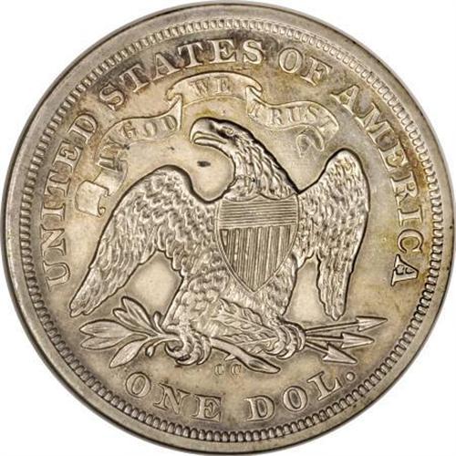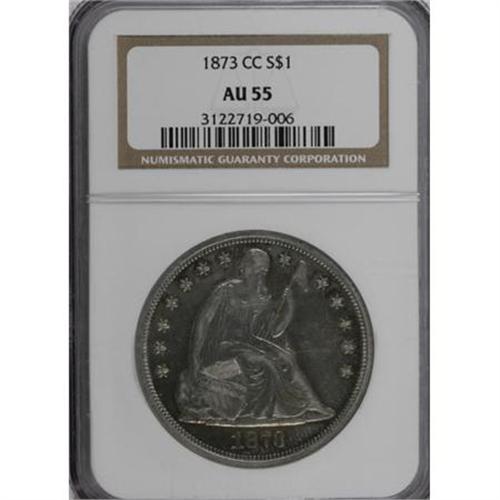 <B>1873-CC $1 AU55 NGC.</B></I> The 1873-CC is the key to the Carson City Seated dollars. Among business strikes of the entire series, it is eclipsed by only the 1870-S and the non-existent 1873-S. The 1873-CC competes in terms of desirability with the original 1851 and 1852 dollars, which also have tiny mintages and low survival rates.<BR> The 1871-CC has a lower production than the 1873-CC, but the latter is rarer. A clue for this is provided by Q. David Bowers in his 1993 tome Silver Dollars & Trade Dollars of the United States. Bowers wrote, "Mintage was 1,000 [pieces] in January and 1,300 [pieces] in March. R.W. Julian suggests the following: 'If the 2,300 were not called for by the silver depositor, it is likely that they would have been melted, and his bullion returned to him. It is my opinion, however, that all the coins were paid out and then perhaps redeposited for trade dollar coinage a few weeks later."<BR> Another possibility for the rarity of the 1873-CC, relative to the lower mintage 1871-CC, is that the entire March delivery of 1,300 pieces was melted soon thereafter, shades of what happened to the ephemeral 1873-S. This scenario leaves only the 1,000 pieces delivered in January. Only one die pair is known, which re-uses the D reverse from 1870. It is possible that the second delivery might have been struck from a different die pair from the first, since there was up to five reverse dies to choose from.<BR> PCGS population data suggests that survivors are approximately evenly spread between the grades of VG10 and AU55, and are extremely rare any finer. Only three pieces from either NGC or PCGS exceed MS61. The present coin lacks the field luster needed for a Mint State designation, but wear is subtle, and largely confined to Liberty's knees and cheek. At first glance, the piece appears Uncirculated, since the moderate golden-brown, ocean-blue, and plum-red toning is similar to that seen on some of the few existing high grade business strike Motto Seated dollars.<BR> As expected of the AU55 level, the obverse field has a few unimportant marks. The reverse is smooth aside from a couple of small laminations near the motto. The eye appeal is imposing, and any Carson City specialist can appreciate the importance of the present offering.<BR><I>From The Queller Family Collection of Silver Dollars.</B></I><BR><BR><B>Coin Engraver:</B> Christian Gobrecht<BR><BR><b>Shipping:</b> Coins & Currency (<a target="_blank" href="http://www.heritageauctions.com/common/shipping.php">view shipping information</a>)
