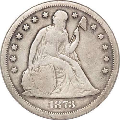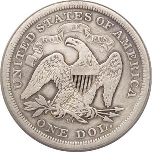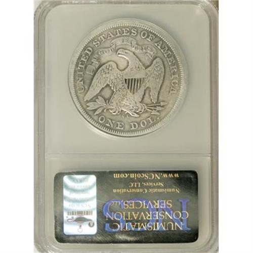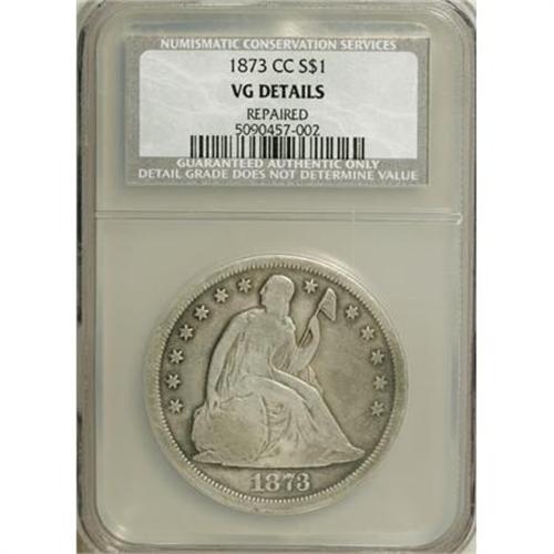 <B>1873-CC $1 --Repaired--NCS. VG Details.</B></I> The 1873-CC is the rarest of all Carson City dollars. This cleaned slate-gray example appears to be carefully smoothed on the reverse field near AMERICA, and on the obverse field near star 13. Still a desirable survivor. Much of the mintage of 2,300 pieces is believed melted to be turned into 1873-CC Trade dollars.<BR><BR><B>Coin Engraver:</B> Christian Gobrecht<BR><BR><b>Shipping:</b> Coins & Currency (<a target="_blank" href="http://www.heritageauctions.com/common/shipping.php">view shipping information</a>)