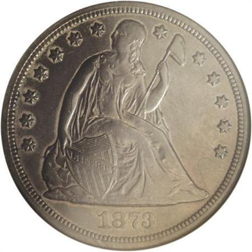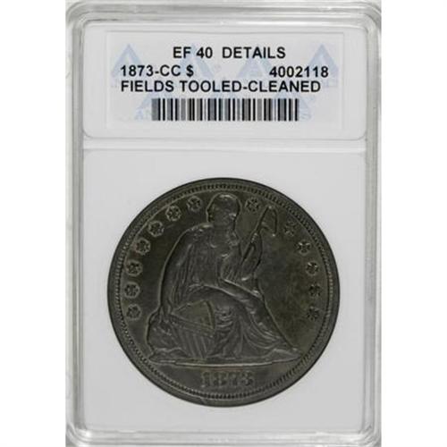 <B>1873-CC $1 --Fields Tooled, Cleaned--ANACS. XF40 Details.</B></I> Darkly toned olive-brown. The obverse field has been skillfully smoothed on each side of the seated Liberty, although it takes patience, a strong light, and an experienced eye to detect the tell-tale swirls of carefully-moved metal. The 1873-CC is the rarest Carson City silver dollar. Much of the tiny mintage of 2,300 pieces was likely melted when the Trade dollar was abolished and Morgan dollar production began.<BR><BR><B>Coin Engraver:</B> Christian Gobrecht<BR><BR><b>Shipping:</b> Coins & Currency (<a target="_blank" href="http://www.heritageauctions.com/common/shipping.php">view shipping information</a>)