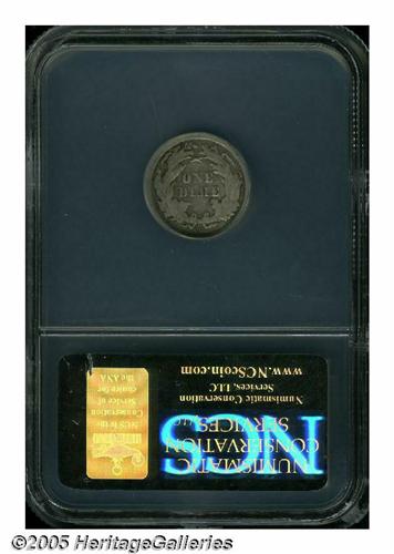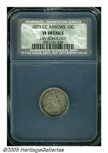 <B>1873-CC<10C> Arrows VF Details, Obverse Scratched, NCS</B></I> In this one auction, collectors of Liberty Seated dimes are given the opportunity to bid on two of the keys to the series, the 1873-CC Arrows and the 1874-CC Arrows. While not as rare as the 1874-CC, the '73-CC is a low mintage issue with only 18,791 pieces struck. Naturally, since it is a Carson City issue, high grade coins are generally not available and problem coins are usually what is available, when offered. This is actually a rather pleasing coin that shows even wear over the devices with light gray patina that deepens around the margins. The only distraction is a long scratch across Liberty's knee and gown.<BR><I>From The Empire State Collection.</B></I>