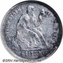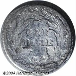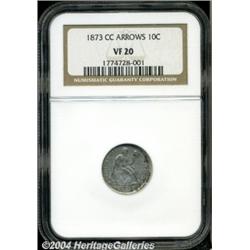 <B>1873-CC<10C> Arrows VF20 NGC.</B></I> An important survivor from an original mintage of just 18,791 pieces (most of which have been lost to circulation), this coin is moderately toned in speckled charcoal-gray shades over the obverse. Well defined over all features save for Liberty's head with some minor field roughness on the obverse. The diagnostic reverse die crack (as struck) through the CC mintmark is discernible under a loupe. After the 1874-CC Arrows and the first-year 1871-CC, the 1873-CC Arrows is the rarest collectible Seated Dime produced in the Carson City Mint. <BR><BR><B>Important notice:</B> Heritage usually auctions material at the rate of 200-250 lots per hour. On some occasions eBay Live bid software or the Internet may not be able to keep up with the pace of the auction. We recommend placing a realistic absentee bid now as insurance to avoid disappointment. Occasionally the auctioneer may eliminate or reject an eBay Live bid, and the auctioneer may also reopen a lot after the close of the eBay live bidding (usually because we missed an audience bid), and may reject your bid even if it shows you as the winning bidder. By bidding via eBay Live, you agree that Heritage may award the lot to another bidder at its sole discretion under the circumstances described above or any other reasonable circumstances. Since eBay bids are not shown to us until we open the lot on the floor, we treat those bids just like floor bids. In most cases the floor responds before the eBay bid is presented to us, due to Internet lag time, so for consistency we have made it a policy that floor bids are always considered first over tie eBay live bids. Also please note that all Heritage lots purchased through eBay Live carry a 20% Buyer's Premium. Please make sure you read the Terms and Conditions before you bid. </span></font></tr></table></td></tr></table>