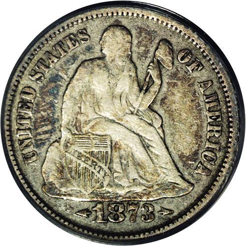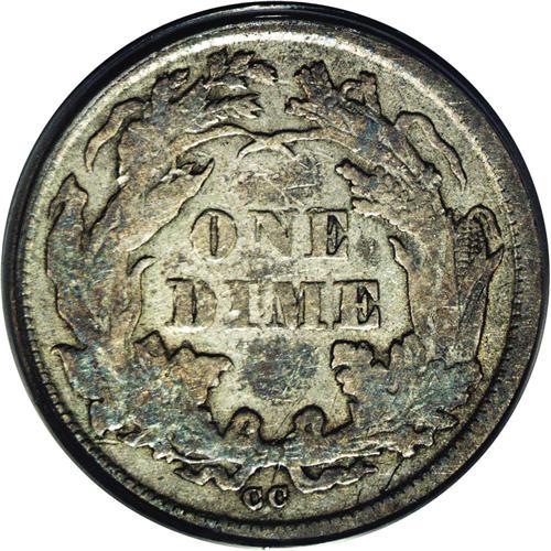 <B>1873-CC<10C> Arrows VF30 PCGS.</B></I> Although not quite the rarity that the 1874-CC is, the 1873-CC with Arrows is one of keys to the Seated dime series in any grade, and collectors hoping to acquire one must take advantage whenever the opportunity presents itself. We are fortunate in this auction to offer more that one specimen of the date, this particular example at VF30 one of the finer that is available. The obverse shows considerable detail under light wear, with dove gray to olive-gold highlights and visible multicolored toning in the fields. As is common for the reverse of dimes of the Obverse Legend subtype, let alone this date, the reverse is somewhat weaker, and strike weakness can be found on the denomination and the lower half of the wreath, yet the overall appearance is quite pleasing. The die crack through the mintmark is diagnostic for the date. This is an attractive circulated key date coin which is rarely found nicer. Population: 3 in 30, 7 finer (8/06).
