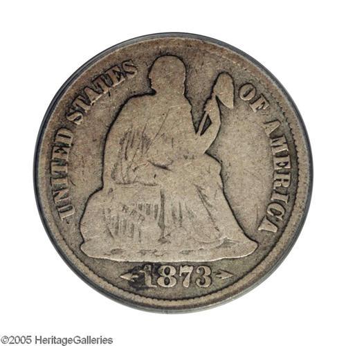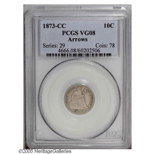 <B>1873-CC<10C> Arrows VG8 PCGS.</B></I> Among the rarest Seated Dime issues, precious few among the 18,791 pieces struck were spared from the rigors of circulation in the West. The tiny number of surviving examples are most often low grade and frequently riddled with problems. This medium-gray representative displays virtually complete rims and shows only a few minor pinscratches here and there. Population: 7 in 8, 23 finer (11/05).