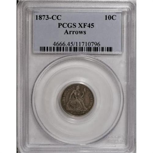 <B>1873-CC 10C Arrows XF45 PCGS.</B></I> The 1873-CC with Arrows is one of the key dates in the Seated Liberty dime series. When found, examples usually grade from Good to Very Fine; higher grade pieces are difficult to locate. Of the approximately 80 specimens certified by PCGS and NGC, about 60 or so grade from Fair 2 to VF20; a mere three Mint State coins have been seen.<BR> The Choice XF example in this lot displays light gray fields that highlight silvery devices that are nicely defined. Both sides are remarkably smooth and clean, a refreshing change from what is typically found on surviving examples that usually have porous surfaces, or other problems (Brian Greer, <I>The Complete Guide to Liberty Seated Dimes</B></I>). The collector putting together a set of Seated dimes should give this Choice coin serious consideration, as a comparable piece may not come along for some time. Population: 2 in 45, 2 finer (12/07).<BR><BR><B>Coin Engraver:</B> Christian Gobrecht<BR><BR><b>Shipping:</b> Coins & Currency (<a target="_blank" href="http://www.heritageauctions.com/common/shipping.php">view shipping information</a>)