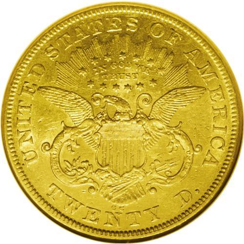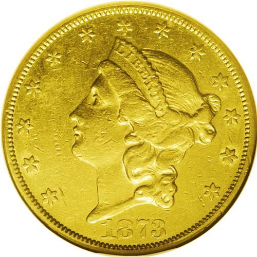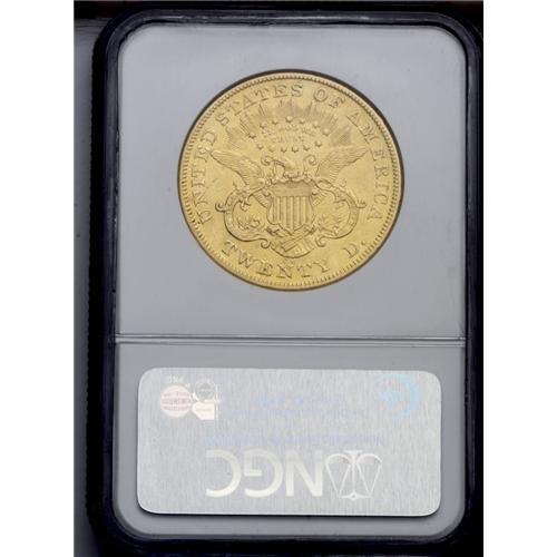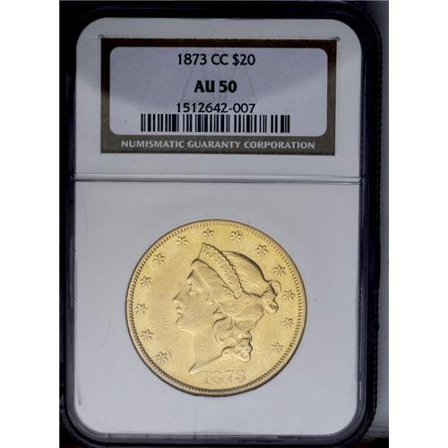 <B>1873-CC<$20> AU50 NGC.</B></I> Variety 1-A. A scarce, low mintage Carson City twenty with only 22,410 coins produced. It is rarely seen above the VF-XF level. This is a bright, yellow-gold example that is reasonably well struck with numerous contact marks visible over the obverse.