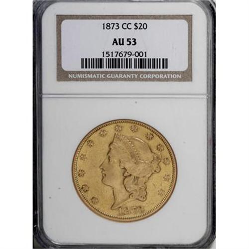 <B>1873-CC $20 AU53 NGC.</B></I> The 1874-CC, 1875-CC, and 1876-CC each have a mintage above 110,000 pieces, but the scarce 1873-CC was limited to 22,410 pieces. This slightly bright example has generally smooth surfaces, aside from a minor reverse rim mark at 7:30. Luster is particularly plentiful on the reverse.<BR><BR><B>Coin Engraver:</B> James B. Longacre<BR><BR><b>Shipping:</b> Coins & Currency (<a target="_blank" href="http://www.heritageauctions.com/common/shipping.php">view shipping information</a>\)