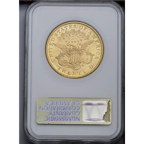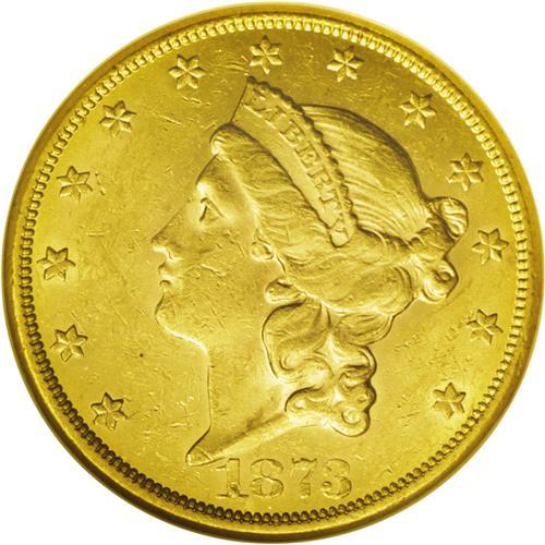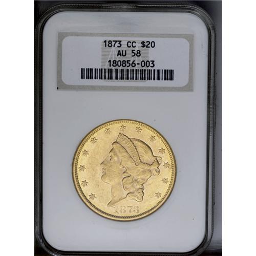<B>1873-CC<$20> AU58 NGC.</B></I> The surfaces of this near-Mint example are highly lustrous with rich orange-gold color and exceptional aesthetic appeal. A hint of frosty pink toning is evident around the devices. Both sides are rather noticeably marked, although only a few marks stand out from all the others. The Carson City Mint only struck 22,410 double eagles in 1873, and all were the Closed 3 date logotype. Despite substantial gold production from the Comstock lode, much of the newly mined gold went either to San Francisco or Philadelphia, with little remaining in Nevada.<BR><I>From The Wyoming Collection.</B></I>