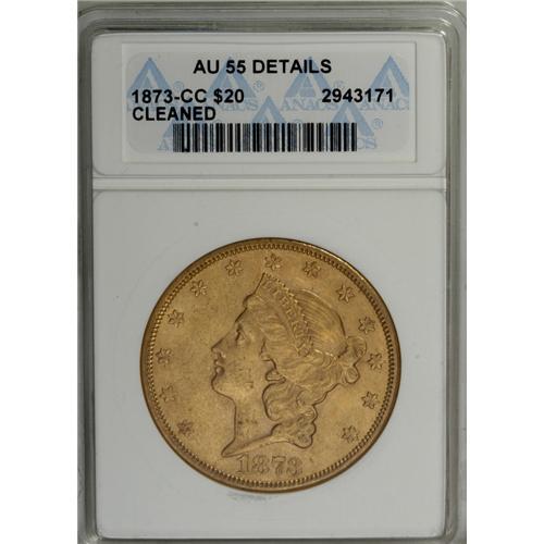 <B>1873-CC $20 --Cleaned--ANACS. AU55 Details.</B></I> This dusky orange-gold CC-mint piece has it share of shimmering luster, and the strike is bold aside from the centers of the first two obverse stars. A couple of small marks are noted on the shield, and patient rotation beneath a light reveals faint hairlines.<BR><BR><b>Shipping:</b> Coins & Currency (<a target="_blank" href="http://www.heritageauctions.com/common/shipping.php">view shipping information</a>)