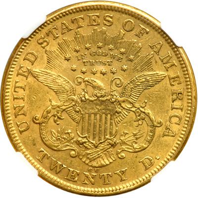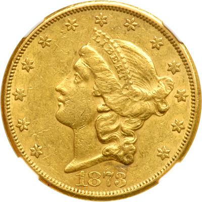 1873-CC $20 Liberty. NGC graded AU-53. Well struck and toned. Only 22,410 pieces struck and a prize in lovely About Uncirculated condition as offered in this Lot. To put it mildly, this is a nicely struck example of the rare Carson City Mint $20 of this year, a specimen that exhibits lovely untouched patina and has evidence of luster within, on top of, and around the major devices. In days gone by, $20 gold pieces weren't collected as numismatic items but they were used as bullion for payment of goods and services rendered or due, and were a major export item in payment for goods purchased across the ocean. Some strange happenstance allowed this attractive coin to remain with collectors, rather than being consigned to the melting pots as was the fate of many gold coins that became worn in use. Recall that gold coins were not collected by mintmark until the 20th century; the few numismatists who could afford them chose to buy Proof strikes from the Mint each year instead. Pop 64 (PCGS # 8968) .