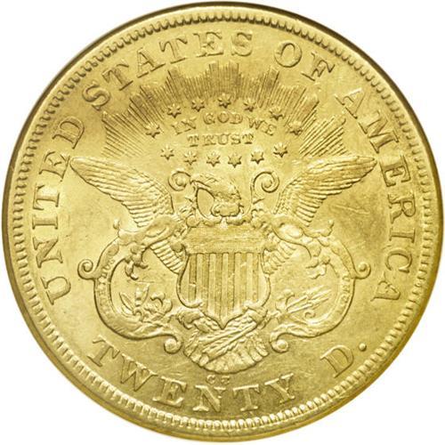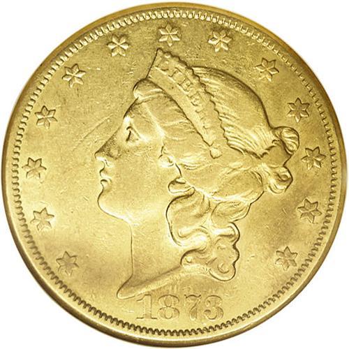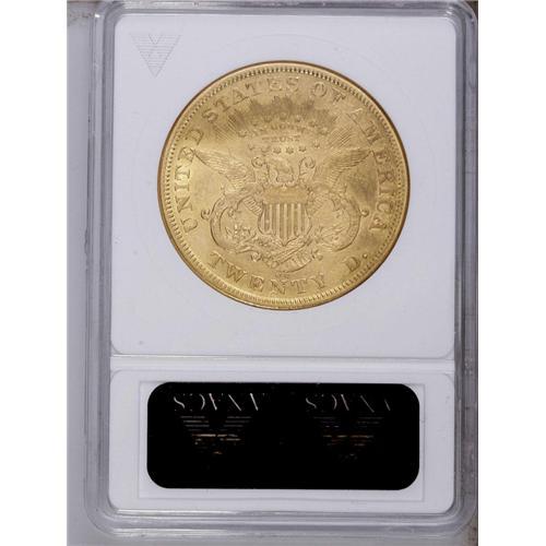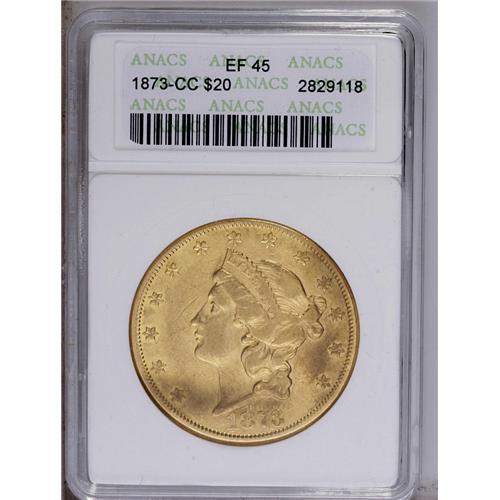 <B>1873-CC<$20> XF45 ANACS.</B></I> A mostly straw-gold piece, although blushes of dusky gray are noted here and there. Remaining luster is obvious, and only a single subdued mark in the field near the nose merits comment. An early, lower mintage CC-mint issue. Unlike the other mints operating in 1873, Carson City struck only Closed 3 gold coins that year.