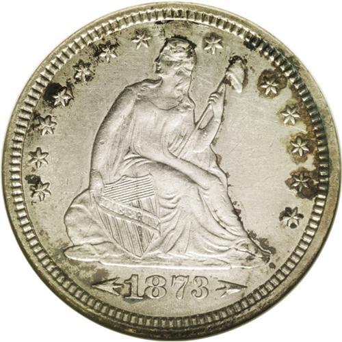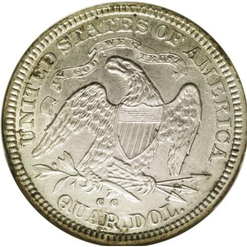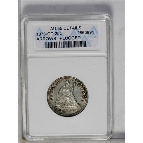 <B>1873-CC<25C> Arrows--Plugged--ANACS. AU55 Details.</B></I> The 1873-CC, with a mintage of 12,462 pieces, is one of the most difficult issues to obtain in the entire Seated Liberty quarter series. That few coins are still extant is apparent from a review of auction appearances, of which there have been less than 40 over the last ten years or so. Seated Liberty specialist Larry Briggs (1991) writes that: "Most pieces are damaged or porous. Nice XF or better examples are prohibitively rare." The AU55 Details specimen in this lot has been inexpertly plugged near the rim at 12 o'clock on the obverse. The upper part of Liberty's head has been reengraved, as has been the R in QUAR on the reverse. The surfaces have a bright silver-gray appearance, with splotches of russet patina around some of the stars. Wispy, but unobtrusive, hairlines are noted, as are some minute contact marks. No surface porosity is apparent.