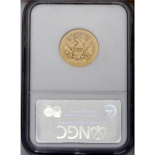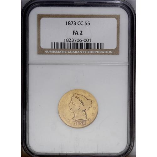 <B>1873-CC $5 Fair 2 NGC.</B></I> An affordable piece with a bold date and mintmark. The left side stars are mostly worn smooth, and the majority of UNITED and FIVE D have merged into the rim. NGC has certified only 40 other examples of this rare, low mintage Carson City issue.