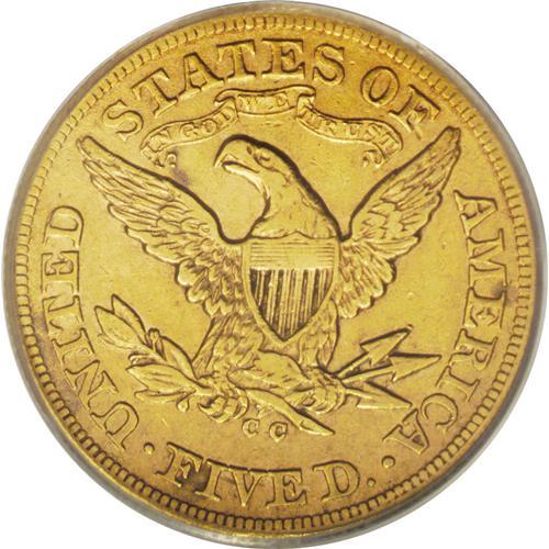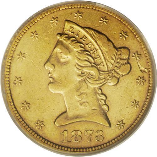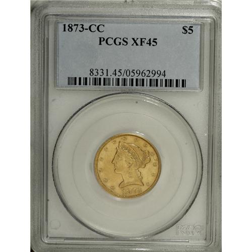 <B>1873-CC $5 XF45 PCGS.</B></I> Closed 3, the only dies known. This is a coin that "Mr. 1873" Harry X Boosel would absolutely drool over, a rarity that is nearly engulfed in the veritable sea of coinage that our nation spewed forth in 1873, a total recorded mintage of nearly 28 million coins! The so-called "Crime of '73" legislated the end of two cent pieces, silver trimes and half dimes, introduced the Trade dollar and omitted the (Liberty Seated) silver dollar from the list of authorized coins, while increasing the weight of minor silver coinage, necessitating the Arrows at Date subtype. All of those moves, along with the Closed 3/Open 3 varieties for many coins, ensured that gold coinage would mostly take a back seat to silver for the year, with the double eagle the sole exception. In fact, less than a half-million gold coins of all denominations from the gold dollar through the eagle were produced in this year. Branch mint coinage was particularly hard hit, as the Carson City Mint, busily engaged in producing Seated Liberty, Arrows at Date half dollars and its first Trade silver dollars (among other coins), produced only minuscule amounts of gold half eagles, eagle, and (mostly) double eagles that amounted <I>in toto</B></I> to 34,369 coins with a face value of $530,710.<BR> The mintage of the 1873-CC Liberty Head half eagle was a paltry 7,416 pieces, and many of those examples circulated extensively, given the understandable need for circulating gold coinage in the West. According to Garrett and Guth, "Many examples are also damaged or heavily cleaned." This piece is a pleasing exception, with only light circulation wear visible over surfaces that retain much luster and some prooflike qualities. A few abrasions and contact marks appear under a loupe, but a surface irregularity between stars 10 and 11 appears to be a planchet flaw, as made. Somewhat lightly struck through the centers, yet still quite rare and attractive. Population: 11 in 45, 7 finer (2/07).<BR><BR><b>Shipping:</b> Coins & Currency (<a target="_blank" href="http://www.heritageauctions.com/common/shipping.php">view shipping information</a>)