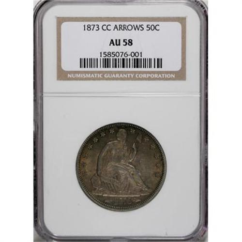 <B>1873-CC 50C Arrows AU58 NGC.</B></I> WB-103. Large Mintmark. A scarce Arrows issue with only 122,500 pieces produced. High grade pieces are especially difficult to locate. Unlike the majority of CC halves from 1870-1874, this piece is sharply struck on the obverse. The reverse is equally well defined. The subdued surfaces show even gray toning with a light undertone of rose. <BR><BR><B>Coin Engraver:</B> Christian Gobrecht<BR><BR><b>Shipping:</b> Coins & Currency (<a target="_blank" href="http://www.heritageauctions.com/common/shipping.php">view shipping information</a>)