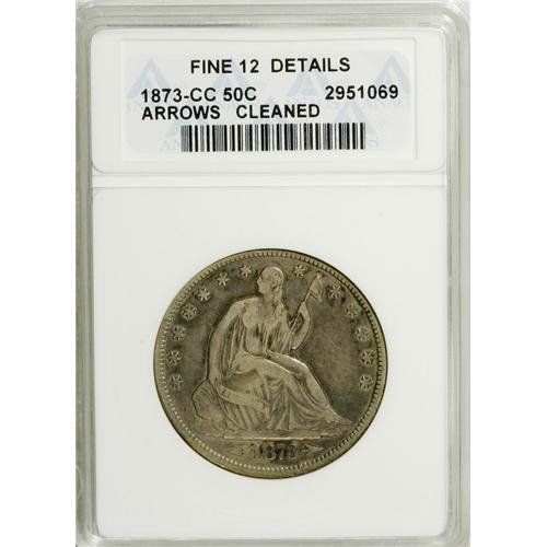 <B>1873-CC 50C Arrows--Cleaned--ANACS. Fine 12 Details.</B></I> NGC Census: (1/84). PCGS Population (5/120). Mintage: 214,560. Numismedia Wsl. Price: $280. (#6344)<BR><BR><b>Shipping:</b> Coins & Currency (<a target="_blank" href="http://www.heritageauctions.com/common/shipping.php">view shipping information</a>)
