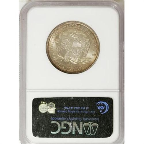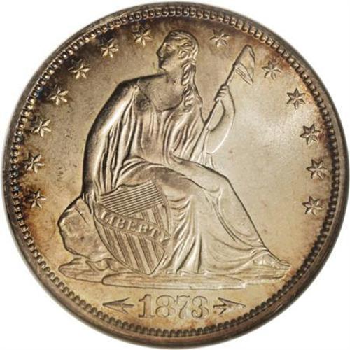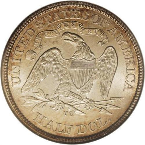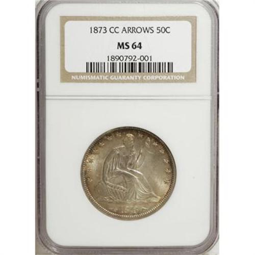 <B>1873-CC 50C Arrows MS64 NGC.</B></I> Among early issues of the Carson City Mint, the 1873-CC Arrows half ranks among the more plentiful issues, not particularly rare in circulated grades, but elusive in Mint State quality. Pieces that rise above the MS60 level are hard to locate, and Choice or Gem quality pieces are extremely rare. NGC and PCGS combined, for example, have only certified four Gem specimens and only 16 Choice Mint State pieces.<BR> This sharply defined example has wonderful champagne toning with peripheral iridescence over frosty luster. A few tiny marks can be seen on each side, but the only singular blemish is a small scrape through E of STATES. Census: 4 in 64, 2 finer (6/07).<BR><BR><B>Coin Engraver:</B> Christian Gobrecht<BR><BR><b>Shipping:</b> Coins & Currency (<a target="_blank" href="http://www.heritageauctions.com/common/shipping.php">view shipping information</a>\)