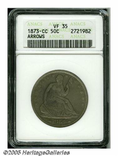 <B>1873-CC<50C> Arrows VF35 ANACS.</B></I> A pleasing, mid-grade example of this scarce With Arrows issue. The surfaces display a mixture of light gray and rose toning over each side. A problem-free coin for the grade.