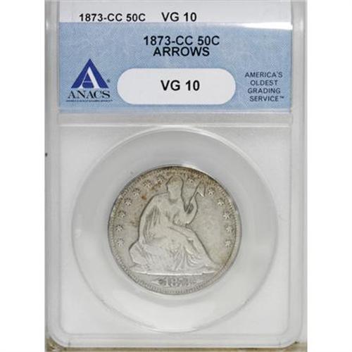 <B>1873-CC 50C Arrows VG10 ANACS.</B></I> NGC Census: (1/65). PCGS Population (1/138). Mintage: 214,560. Numismedia Wsl. Price for NGC/PCGS coin in VG10: $293. (#6344)<BR><BR><B>Coin Engraver:</B> Christian Gobrecht<BR><BR><b>Shipping:</b> Coins & Currency (<a target="_blank" href="http://www.heritageauctions.com/common/shipping.php">view shipping information</a>)
