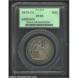 1873-CC 50C Arrows XF45 PCGS. Lilac-gray in color, with traces of darker patina near Liberty's pole.