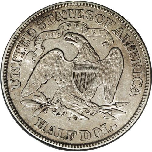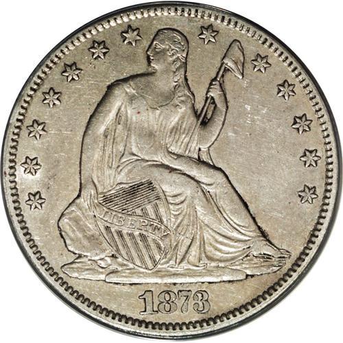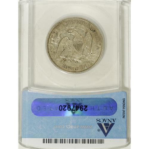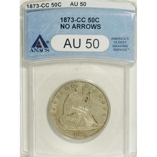<B>1873-CC 50C No Arrows AU50 ANACS.</B></I> The Carson City Mint struck both No Arrows and Arrows varieties of Seated halves in 1873. The mintage of the No Arrows is 122,500 pieces, significantly less than its Arrows counterpart, although both are similarly priced in circulated grades. The No Arrows variety is rarer in Mint State. This sharply struck and attractive example exhibits faint tan and sky-blue toning.<BR><I>From The Reginald Byron Mason Collection.</B></I><BR><BR><b>Shipping:</b> Coins & Currency (<a target="_blank" href="http://www.heritageauctions.com/common/shipping.php">view shipping information</a>)