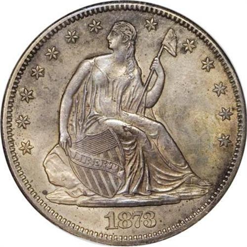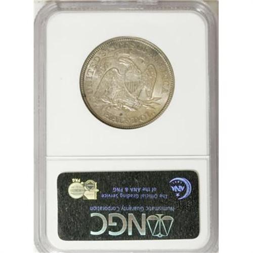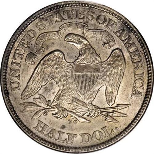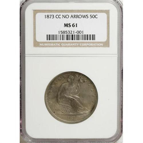 <B>1873-CC 50C No Arrows MS61 NGC.</B></I> The 1873-CC No Arrows half dollar is a scarce variety, somewhat scarcer than its With Arrows counterpart thanks in large part to the fact that roughly half as many were minted. It is a tough call as to whether this coin would rise to the level of a key date in the series, yet this in itself is notable, in that the 1873-CC No Arrows dime and quarter are each legendary rarities with a mere half dozen pieces known <I>combined</B></I>. <BR> Similar to the other pieces from the early days of this storied Mint, most 1873-CC halves went directly into circulation and stayed there, so while these coins are occasionally available in circulated grades, as evidenced by the listings in our Auction Archives, uncirculated pieces are quite scarce. The last Mint State 1873-CC No Arrows half dollar Heritage offered at auction was an MS63 piece that sold in our February 2005 Long Beach Signature Auction; collectors since then have likely had to settle for coins that are circulated, have problems, or both.<BR> This coin is a softly lustrous, predominantly olive-gold piece. The surfaces are by no means pristine, but are remarkably free of the distractions one might ordinarily expect from a coin with this modest Mint State grade. Perhaps the only distracting aspect of this coin's appearance is a planchet flaw (as struck) visible on Liberty's right leg near the shield. The overall appearance is certainly quite pleasing, and discriminating collectors of high-end Seated Liberty coinage should carefully consider this piece. It may be some time before a similar opportunity arises again.<BR> <BR><BR><B>Coin Engraver:</B> Christian Gobrecht<BR><BR><b>Shipping:</b> Coins & Currency (<a target="_blank" href="http://www.heritageauctions.com/common/shipping.php">view shipping information</a>\)
