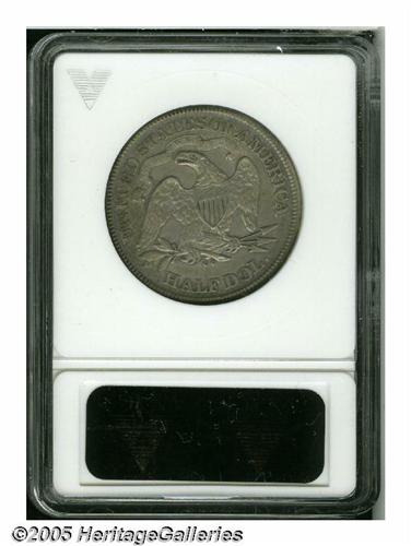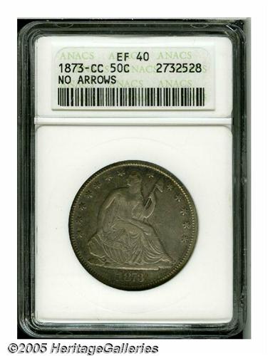 <B>1873-CC<50C> No Arrows XF40 ANACS.</B></I> Many of the 122,500 No Arrows Half Dollars produced by the Carson City Mint in 1873 are believed to have been melted to provide bullion for the first Arrows coinage. This fortunate survivor retains fairly strong detail, and displays light golden-gray patina imbued with magenta and cobalt-blue accents. The relatively clean surfaces show just a few minute obverse marks, none of which are worthy of individual mention.<BR><I>From The Empire State Collection, Part Two.</B></I>