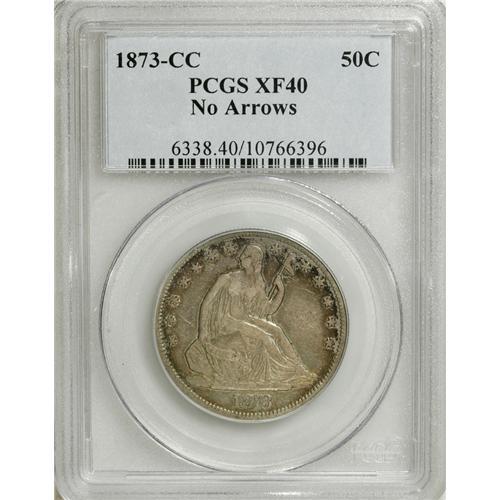 <B>1873-CC 50C No Arrows XF40 PCGS.</B></I> The allure of the Carson City Mint is difficult to resist, and the Seated Liberty coins produced there in its early years offer a different perspective from the Morgan dollars and gold pieces. This lightly worn piece has few marks and exhibits reddish-orange patina at the peripheral areas, while the centers are silver-gray. Population: 10 in 40, 28 finer (3/07).<BR><BR><b>Shipping:</b> Coins & Currency (<a target="_blank" href="http://www.heritageauctions.com/common/shipping.php">view shipping information</a>)