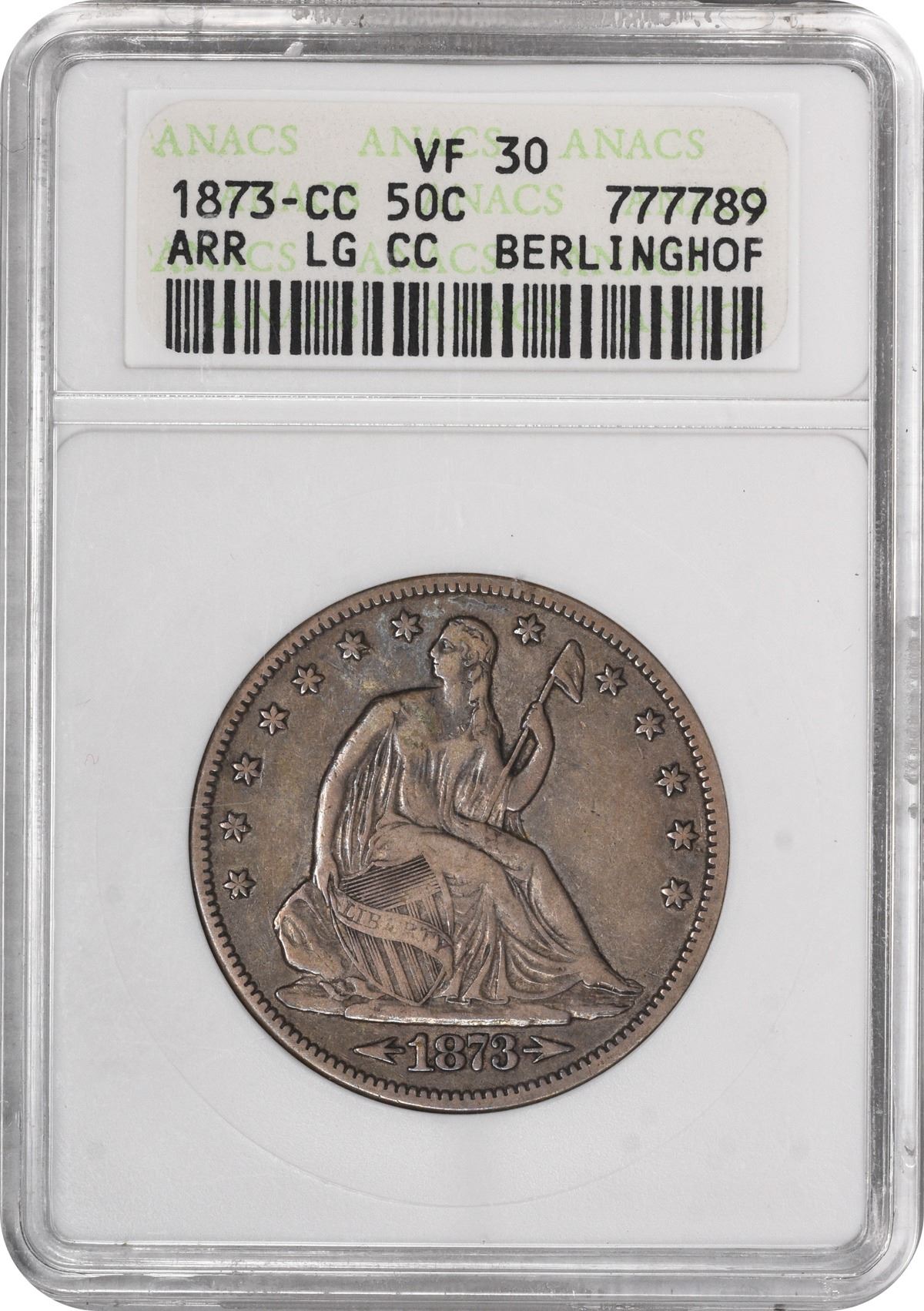 Pleasingly even lilac-gray throughout with a hint of rose and blue iridescence in a bold light source. The eye appeal is substantial, the surfaces are exceptionally mark-free in spite of the years of circulation, and the devices are sharp for the grade. Absolutely the right choice for a mid-grade type set or Carson City collection, this attractive half dollar is all the grade claims and then some. Housed in an old-style small ANACS holder.