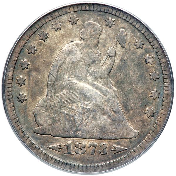 1873-CC Liberty Seated Quarter Dollar. Arrows. PCGS graded Fine-15. A very rare date. Medium gray toning with some hints of gunmetal-blue variegation that seem to point to many decades in an old coin envelope or to storage in an early collector's Cabinet. Normal wear for the grade designs dictates the Fine classification, but certainly this coin is high end among such. Of the 1873-CC With Arrows quarters, just 12,462 were minted, this in an era in which no numismatist collected branch mint coinage (or at least no record has been recorded of one). That being the case, the mintage slipped into circulation unnoticed, where in time individual examples became quite worn. Today the 1873-CC With Arrows is rarely offered. When it is, typical grades are below the present piece. Again, this is a remarkable opportunity. Pop 5; 24 finer (PCGS # 5492) .
