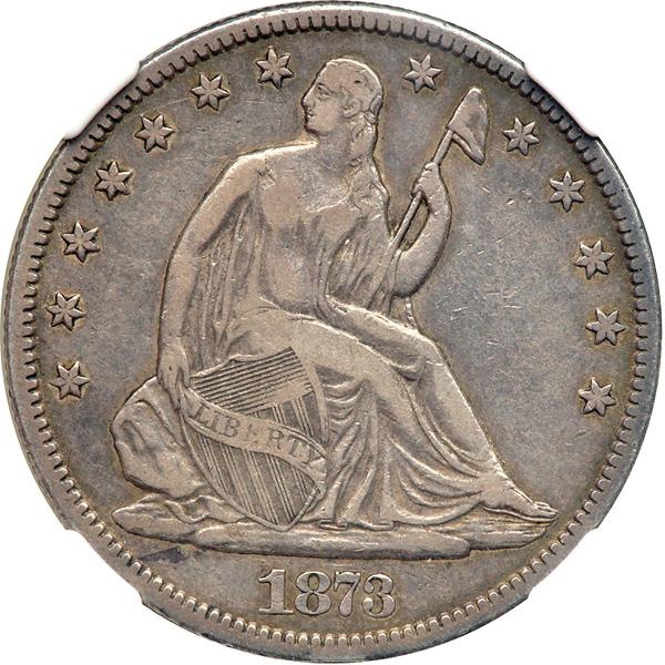 1873-CC Liberty Seated Half Dollar. No arrows. NGC graded VF-35. Nice even toning, full strong LIBERTY on the shield. Closed 3 in date on this variety.