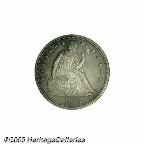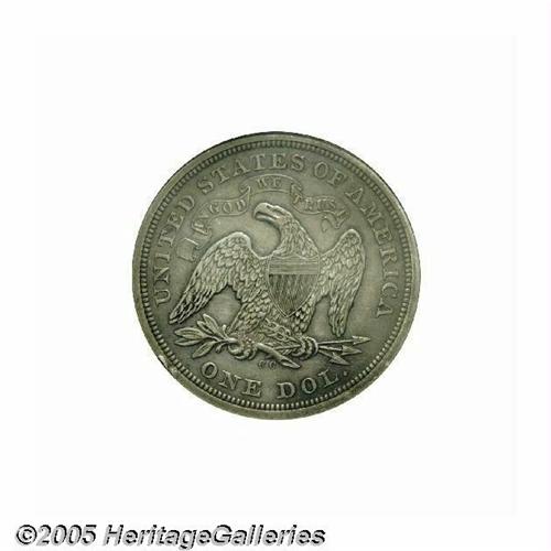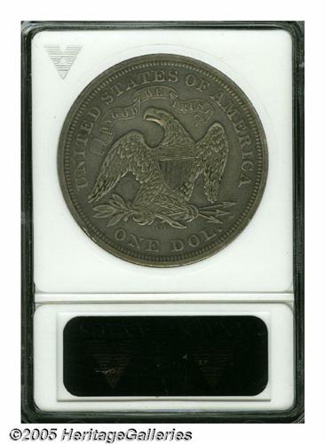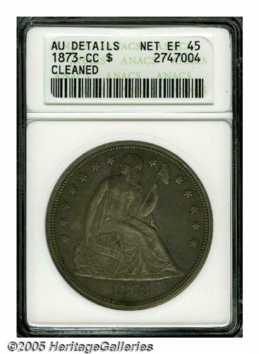 <B>1873-CC<S$1>--Cleaned--ANACS. AU Details, Net XF45</B></I> The 1873-CC Seated Dollar is an extremely scarce final year issue and the rarest of the four Carson City issues in the series, with only a tiny percentage of the already low 2,300 pieces struck being extant. While we cannot disagree with the "cleaned" qualifier assigned to this example, there is minimal ill-effect at arm's length. Steel-gray surfaces are well balanced and without appreciable marks, showing deeper antique-golden and gunmetal peripheral accents.