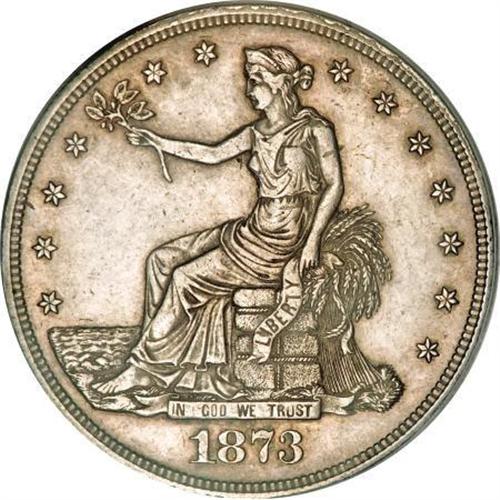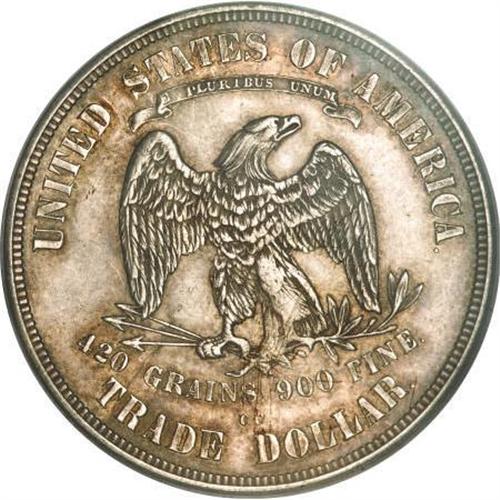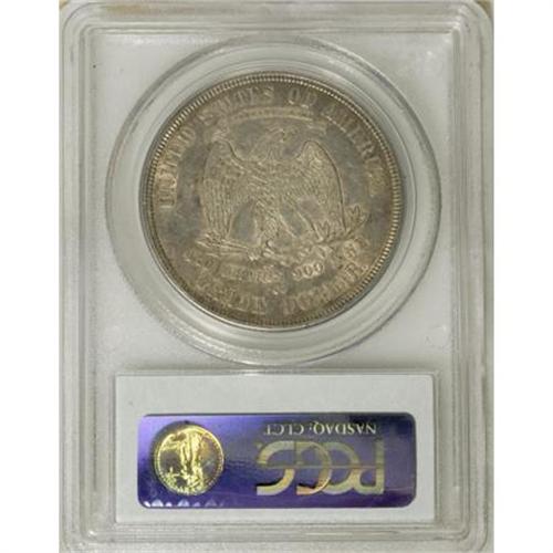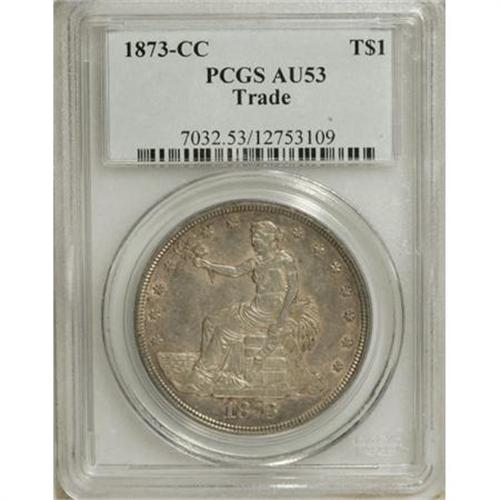 <B>1873-CC T$1 AU53 PCGS.</B></I> Despite a mintage exceeding 100,000 coins, the 1873-CC trade dollar is a rarity in the series, only occasionally uncounted in Mint State or AU grades. Pale gold and lilac toning serve to accent the silver surfaces and considerable luster. The top of the left (facing) wing is slightly weak, but all remaining detail is bold.<BR><BR><B>Coin Engraver:</B> William Barber<BR><BR><b>Shipping:</b> Coins & Currency (<a target="_blank" href="http://www.heritageauctions.com/common/shipping.php">view shipping information</a>)