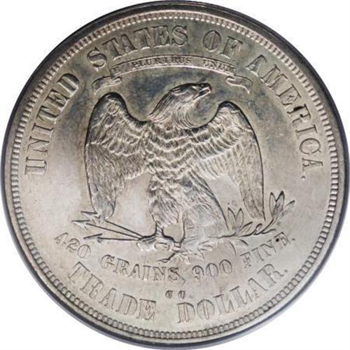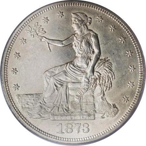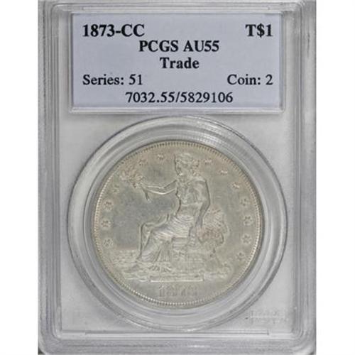 <B>1873-CC T$1 AU55 PCGS.</B></I> Trade dollar specialists are intimately familiar with the difficulty presented by the 1873-CC, a date that seldom appears in grades higher than XF, when it appears at all. This Choice AU piece has satiny silver surfaces with slight reflectivity in the fields, and pale champagne toning on both sides.<BR><BR><B>Coin Engraver:</B> William Barber<BR><BR><b>Shipping:</b> Coins & Currency (<a target="_blank" href="http://www.heritageauctions.com/common/shipping.php">view shipping information</a>)