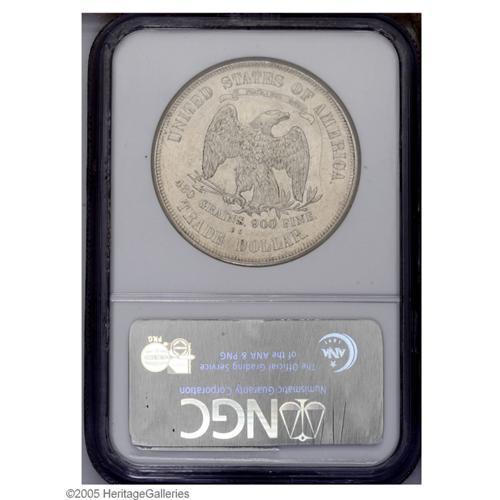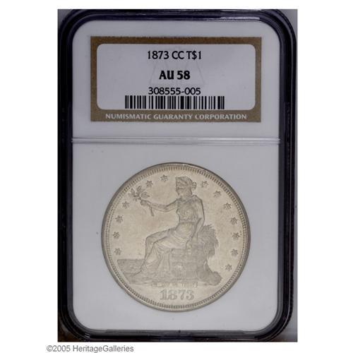 <B>1873-CC<T$1> AU58 NGC.</B></I> Fully brilliant and essentially Mint State with only the slightest break in the luster on each side. The surfaces are satiny and slightly prooflike. As the first Carson City Mint Trade Dollar, this is a scarce and desirable issue. Only 124,500 coins were struck, and many in not most of those were exported to the orient and later melted. Much scarcer than the moderately low mintage would imply.